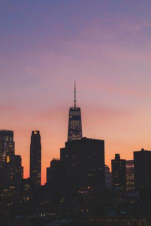 Sunset outlining the One World Trade Center in the heart of the financial district.